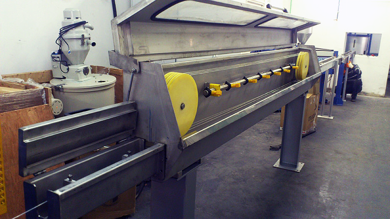 Kablo üretiminde kullanılan su kanallarımız ekstruder kapasitesine ve imalatı yapılacak kablolara uygun olarak boyları ve soğutma hesapları yapılarak uygun tanklarımız 304 kalite paslanmaz sacdan imal edilmektedir. Kasnaklar ise Alüminyumdan imal edilip Eloksal kaplanmaktadır.Kablonun çevresinde eşit soğutma yapılarak kablonun düzensiz üretilmesinin önüne geçilmiştir.